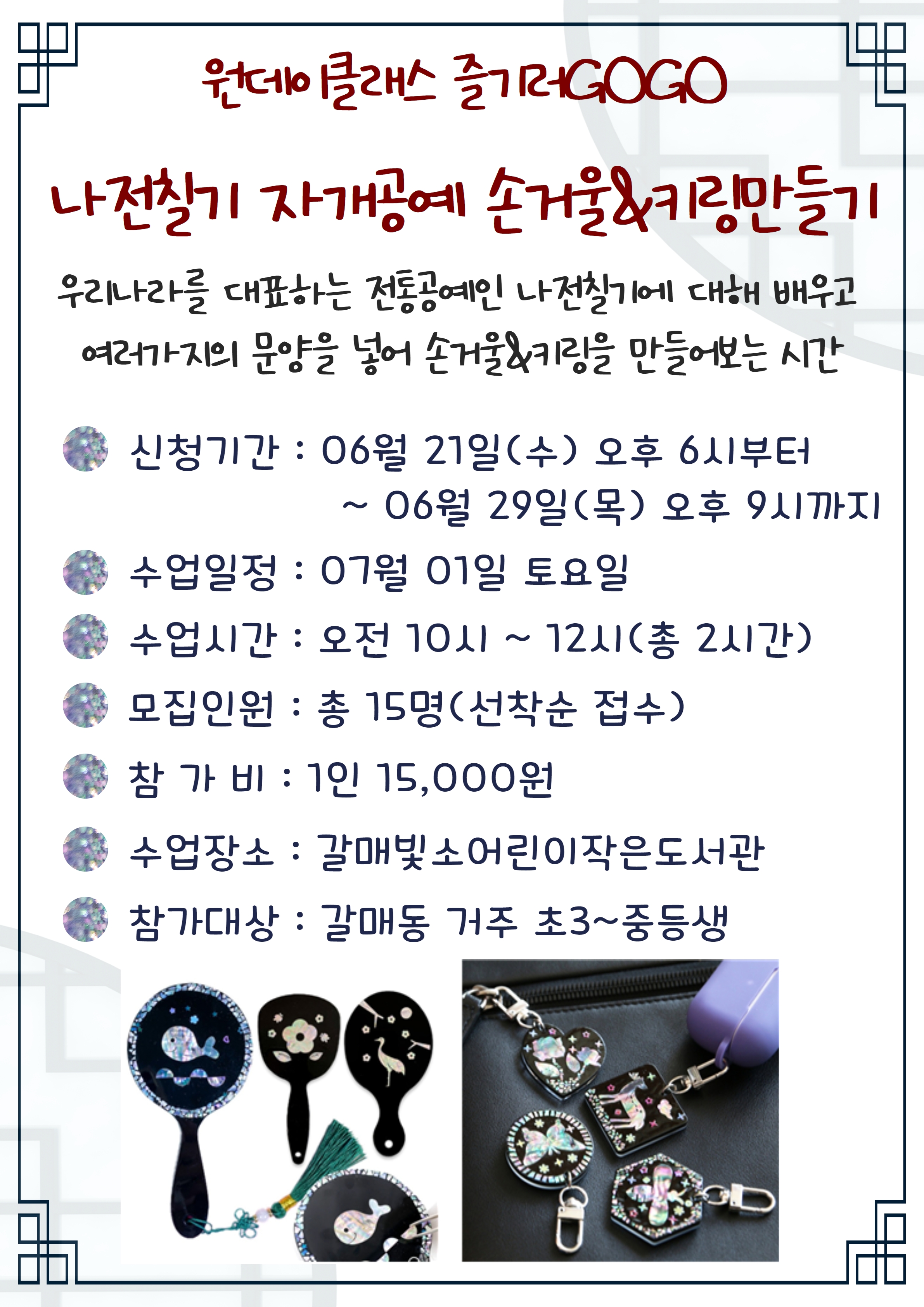 | 프로그램명 | 2023 찾아가는 청소년수련관 원데이클래스 <나전칠기 자개공예 손거울&키링만들기> *갈매동거주/보호자 연락처 필수* |