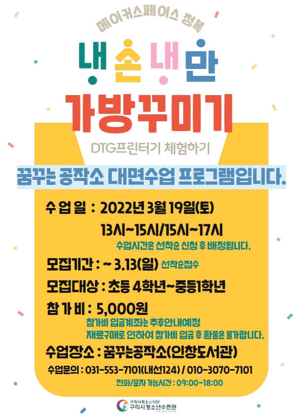 | 프로그램명 | 메이커스페이스 정복-내손내만 가방꾸미기 *3월 17일 추가모집* |
