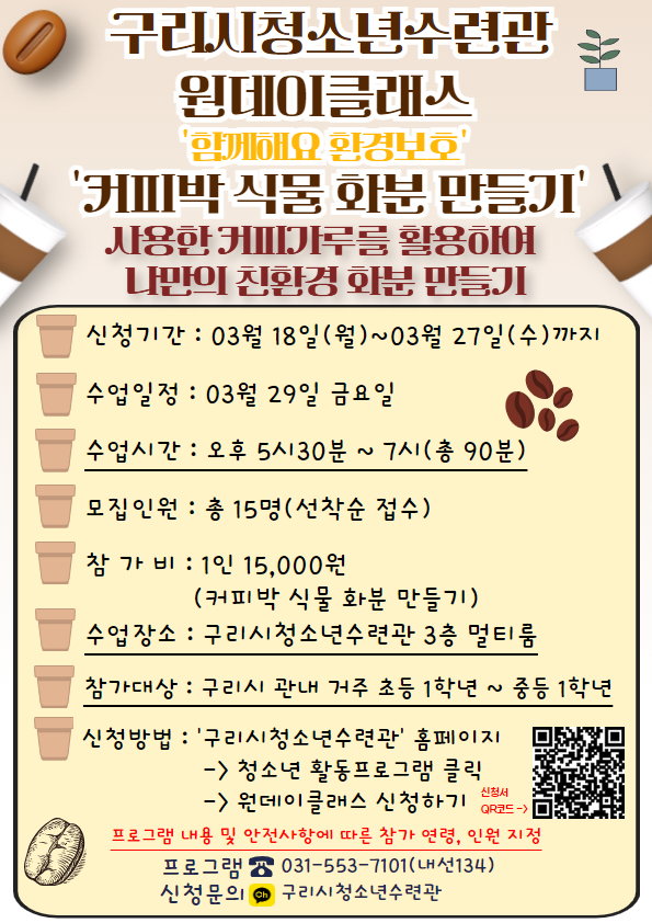 | 프로그램명 | 구리시청소년수련관 원데이클래스 '커피박 식물 화분 만들기' |