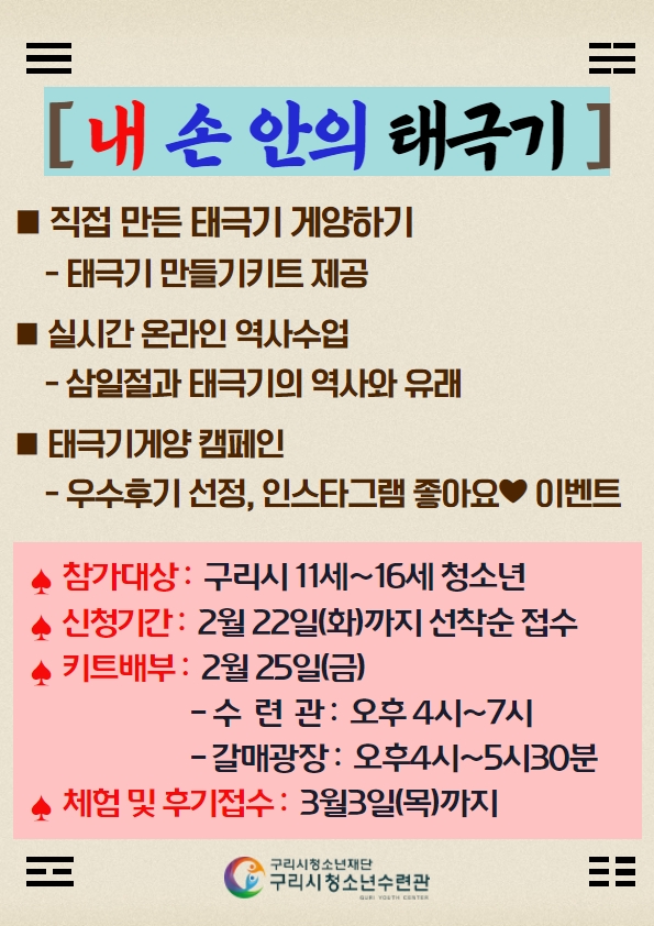 1. 프로그램 세부 내용 - 온라인 역사수업 : 삼일절, 태극기의 역사와 유래 - 나만의 태극기 만들기 : 키트를 활용한 태극기 만들기 - 태극기게양 캠페인 : 삼일절 태극기 게양 및 우수후기 선정 개인 인스타그램 게시글 좋아요 이벤트 2. 참가대상 : 구리시 거주 또는 재학중인 11세~16세 청소년