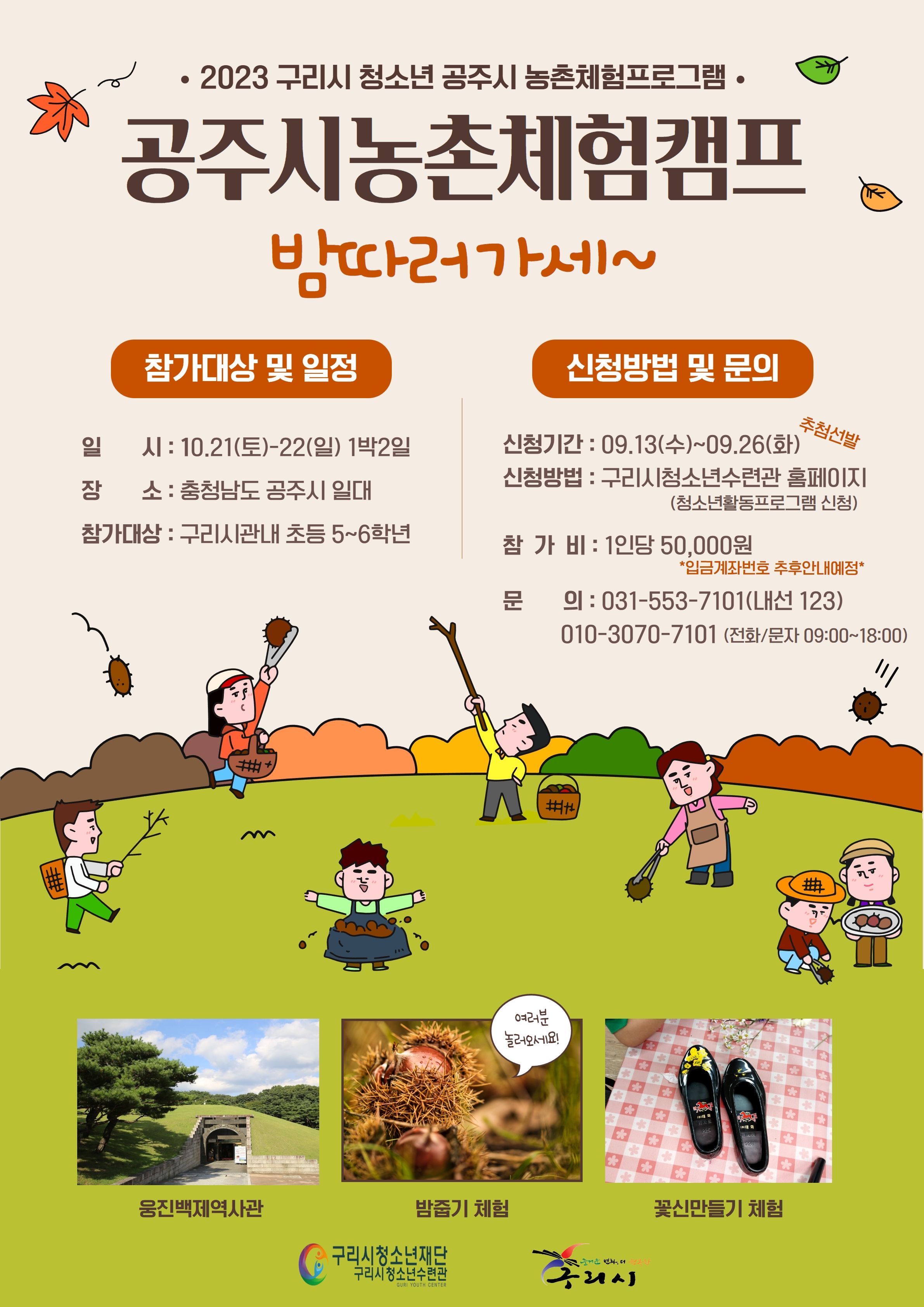 1. 신청안내 - 신청기간 : 9월 13일 09:00 ~ 9월 26일 18:00 - 신청대상 : 구리시 거주 또는 재학중인 12세~13세 청소년 30명 - 선발방법 가. 각 우선순위별 대상자 선별 후 잔여인원 대상으로 전자추첨 선발 나. 우선순위 대상자가 정원초과 될 경우에는 전자추첨 선발 - 선발순위 가. 1순위 : 수련관 청소년캠프 신규참가자(2022~23년 캠프 참가 기준)중 소외계층 청소년(기초수급, 차상위, 한부모가정) 나. 2순위 : 수련관 청소년캠프 신규참가자(2022~23년 캠프 참가 기준) 다. 3순위 : 1,2순위 해당하지 않는 청소년 라. 청소년활동프로그램 참가경력은 수련관 캠프 참가 기준 *취소자 발생 시 선발순서로 개별연락예정 - 신청방법 : 온라인 신청 *참가자 선정 후 개인정보수집(보험가입용)을 위하여 선발 후 참가신청서를 재작성 예정* 2. 캠프안내 - 운영일정 사전모임 : 10월 20일(금) / 수련관에서 진행 캠프운영 : 10월 21일(토)~22일(일) / 1박2일 - 운영장소 :충청남도 공주시 일대 - 주요활동 : 공산성, 웅진백제역사관, 무령왕릉˙왕릉원, 공주제일교회, 농촌체험마을 3. 참가비용 : 1인 5만원(*입금계좌 추후안내) 4. 사전활동 안내 - 캠프 사전안내 및 교육을 위하여 참가자 및 보호자 중 1인 이상 필수참석 - 운영일정 : 10월 20일(금) 17:00~18:00 - 운영장소 : 구리시청소년재단 1층 공연장 - 운영내용 : 참가자 및 보호자 대상 캠프 오리엔테이션 및 사전교육 진행 5. 문의 - 구리시청소년수련관 청소년활동팀 - Tel : 031)553-7101 / 내선123 - H.P : 010-3070-7101 (전화/문자 09:00~18:00) *본 청소년캠프는 청소년수련활동신고를 완료한 청소년활동프로그램입니다. |