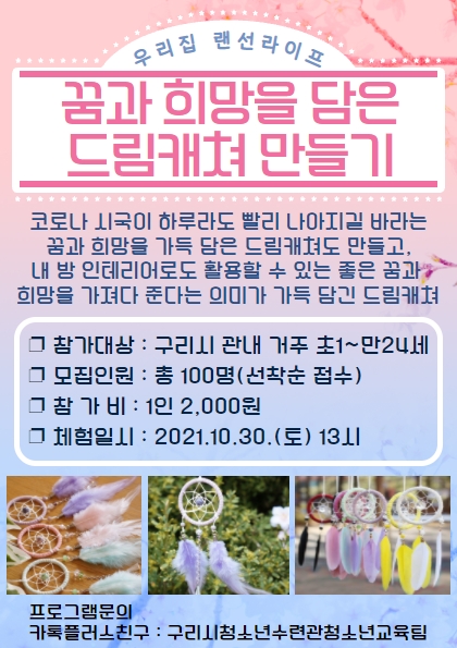 코로나 시국이 하루라도 빨리 나아지길 바라는 꿈과 희망을 듬뿍!! 그리고 내 방 인테리어로도 활용이 가능하고, 집이나 내 방에 걸어두면 좋은 꿈과 희망을 가져다 준다는 의미가 가득 담겨있고, 직접 기본틀에 실과 예쁜 구슬을 엮고 연결해서 만드는 드림캐쳐 만들기 시간입니다! * 신청일시 : 2021.10.21.목 오전09시부터(선착순모집) * 신청방법 |