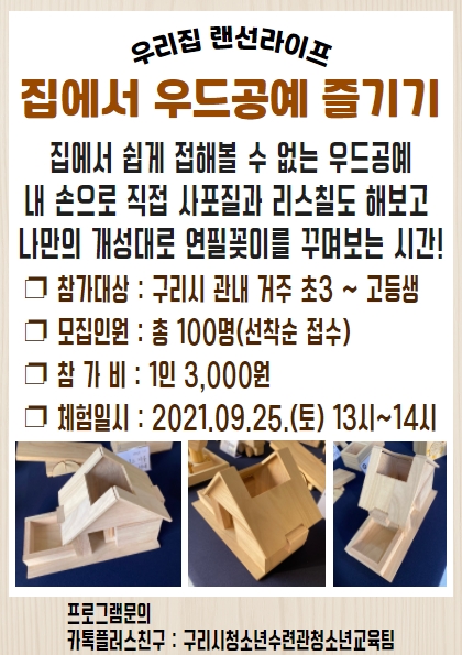 집에서 쉽게 접해볼 수 없는 우드공예 * 신청일시 : 2021.09.13.월 오전10시부터(선착순 접수!) 이번 수업은 새로운 선생님과 함께 진행됩니다! |