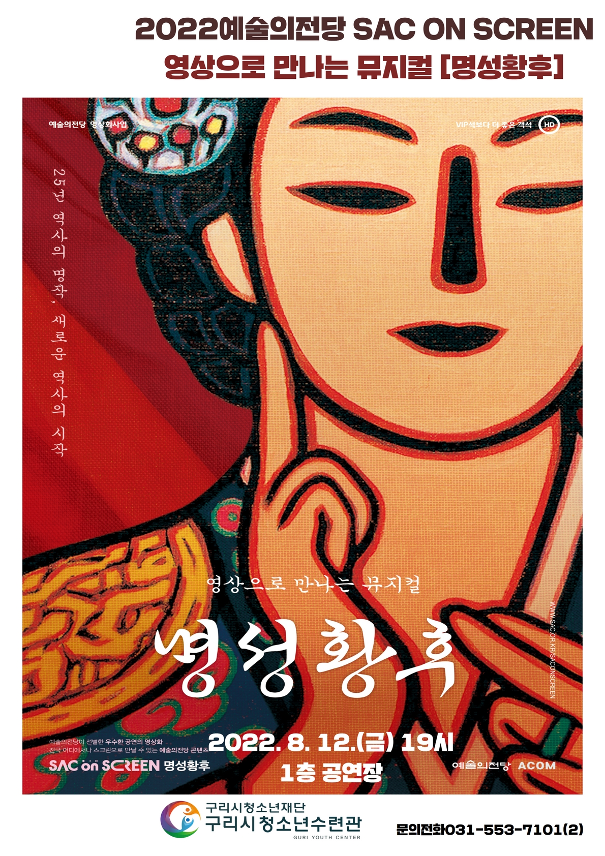 2022 예술의전당 SAC ON SCREEN (삭온스크린) : (Seoul Arts Center on Screen) 삭 온 스크린((영화처럼 공연을 무대 곳곳에서 촬영하여 클로즈업 된 배우의 얼굴, 무대의 뒷모습 등도 볼 수 있도록 하는 예술의 전당 영상화 사업)) [8월 공연일정] # 영상으로 만나는 뮤지컬 [명성황후] 8월12일 오후7시 (상영시간 85분)