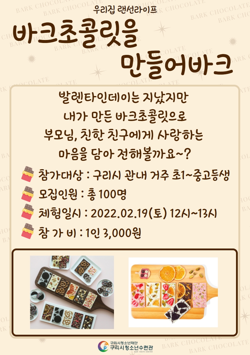 우리집 랜선라이프 – 바크초콜릿을 만들어바크 * 신청일시 : 2022.02.11.(금) ~ 02.16.수 (선착순모집) |