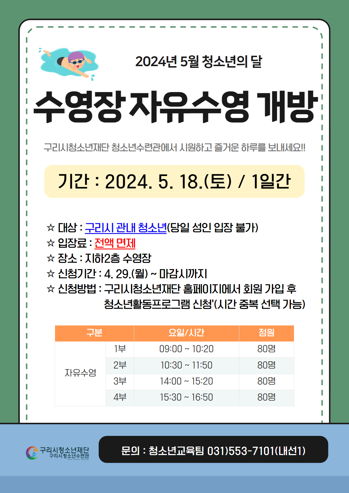 [‘2024년 5월 청소년의 달’ 수영장 자유수영 개방]