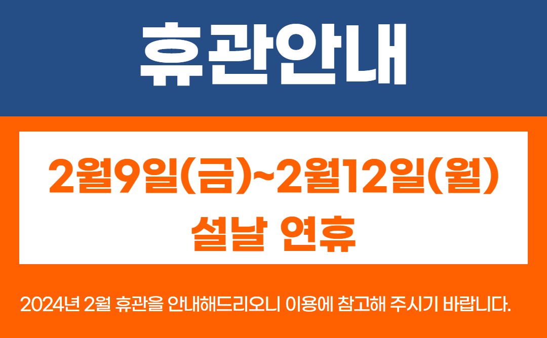 [휴관] 2024년 2월 휴관안내 작성자 이경주 등록일자 2024년 2월 5일 16시 15분 54초 조회 590 [2024년 2월 휴관안내] 휴관안내.jpg [ Size : 92.88KB , Down : 218 ] 미리보기 다운로드 목록보기