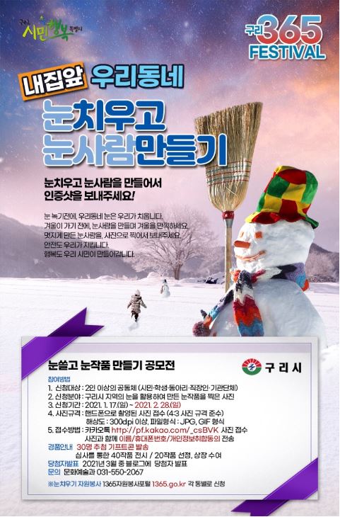 내 집 앞 눈은 내가 치우기 홍보안내 작성자 관리자 등록일자 2021년 1월 17일 17시 19분 52초 조회 1,215 □ 내 집 앞 눈은 내가 치우기! 내일은 폭설이 예보되어 있습니다. 눈이 많이 쌓이면 구리시 청소년 여러분들도 가족과 함께 내 집 앞 눈 치우기에 참여해 주시기 바랍니다. 청소년 여러분의 성숙한 시민의식으로 내가족 내이웃이 안전해집니다. 눈 치우기.JPG [ Size : 88.93KB , Down : 386 ] 미리보기 다운로드 목록보기