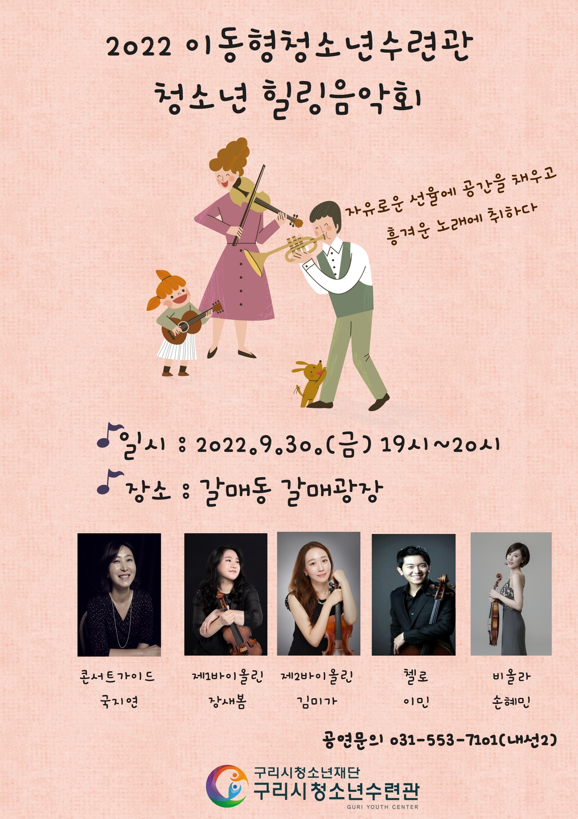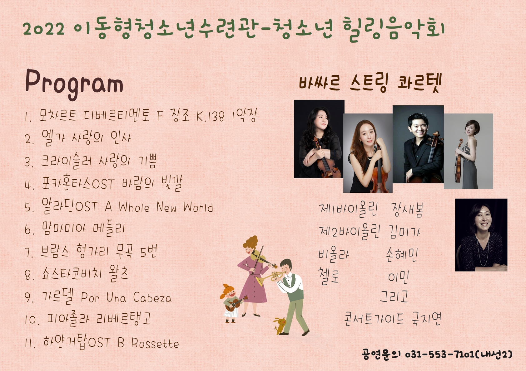2022 이동형청소년수련관-청소년힐링음악회 작성자 관리자 등록일자 2022년 9월 23일 19시 11분 55초 조회 555 [2022 이동형청소년수련관 - 청소년힐링음악회] 관련사진-청소년 힐링음악회.jpg [ Size : 1.31MB , Down : 376 ] 미리보기 다운로드 2022힐링음악회1.jpg [ Size : 1.34MB , Down : 368 ] 미리보기 다운로드 목록보기