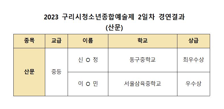 2023 구리시청소년종합예술제 산문 경연결과 작성자 관리자 등록일자 2023년 6월 22일 12시 17분 47초 조회 519 경연에 참가한 모든 청소년 여러분 수고하셨습니다. 000000.JPG [ Size : 37.66KB , Down : 404 ] 미리보기 다운로드 목록보기