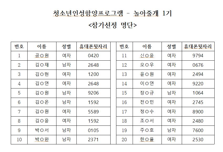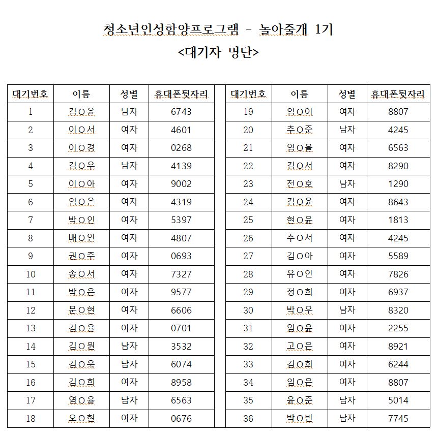 인성함양프로그램 - 놀아줄개 1기 참가자 선정결과 안내