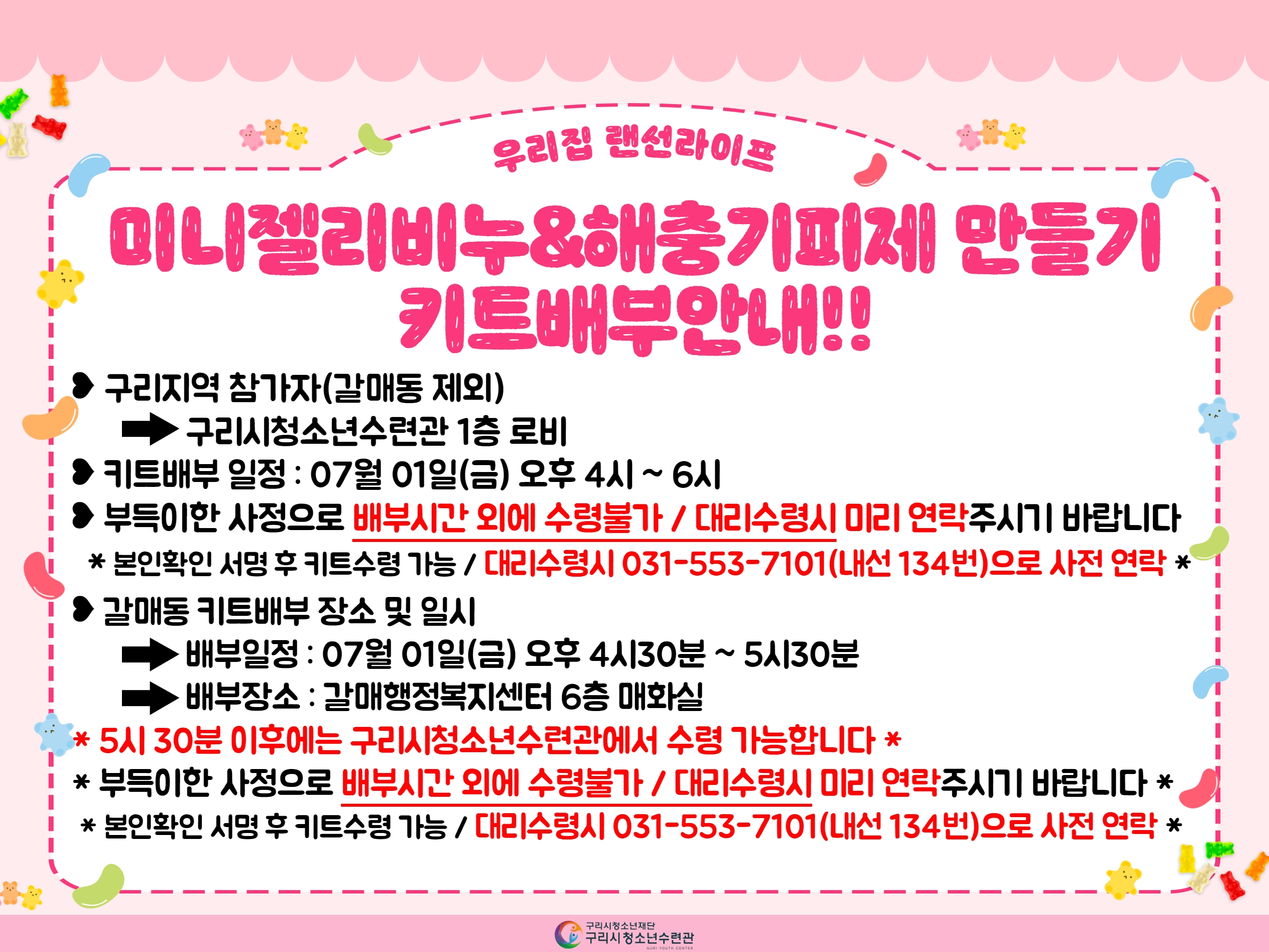 * 수련관 키트배부 시간/장소 : 7월 1일(금) 오후 4시~6시까지 구리시청소년수련관 1층