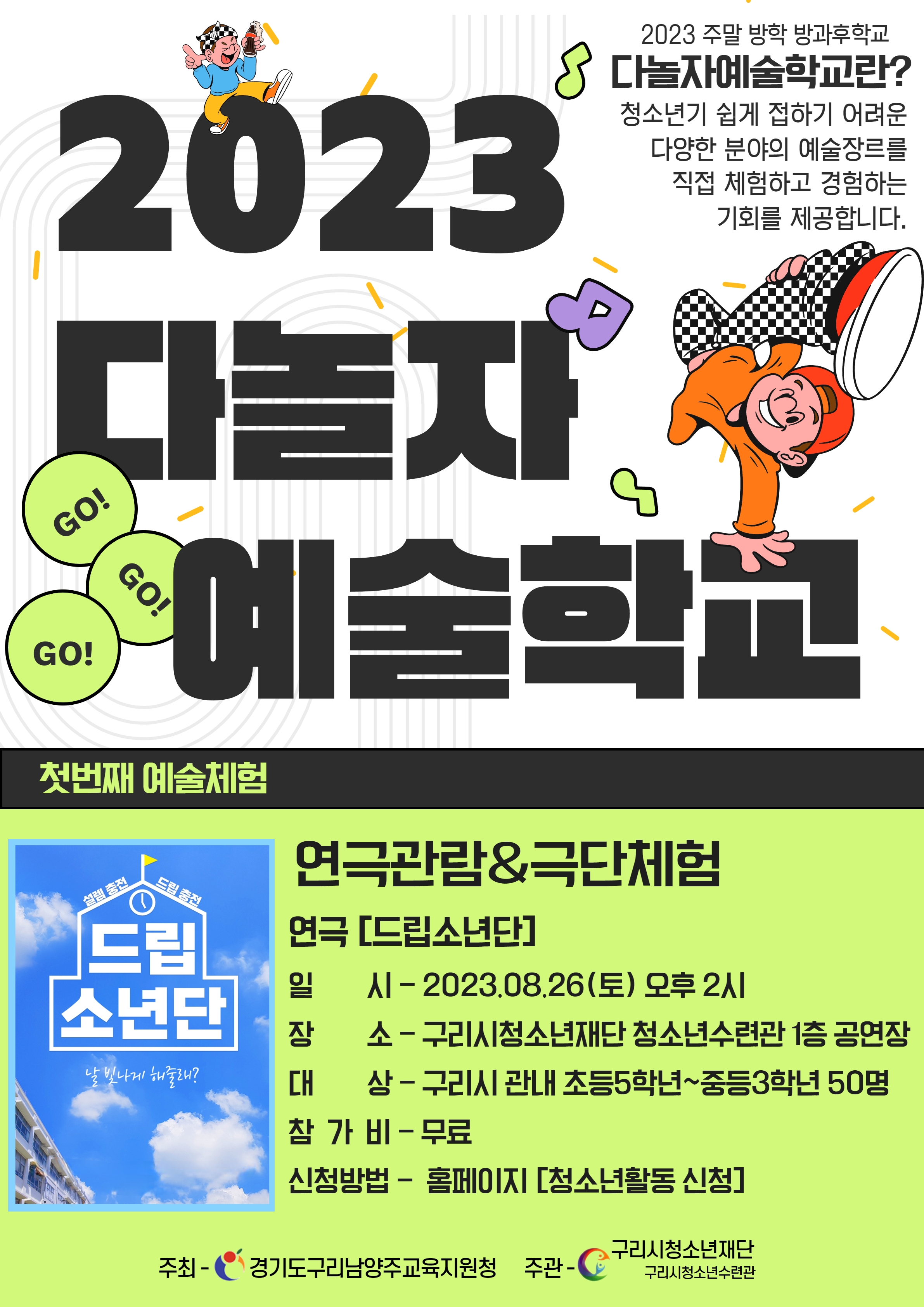 2023 주말 방학 방과후학교 "다놀자 예술학교" 참가자 1차 모집 작성자 정수환 등록일자 2023년 8월 3일 9시 54분 3초 조회 596 2023 주말 방학 방과후학교 - 다놀자 예술학교 1차 모집기간 : 2023. 7. 27. ~ 8. 19.모집대상 : 구리시 관내 청소년 초등5학년~중등3학년모집인원 : 50명(인원초과 시 전자추첨)참가비용 : 무료 다놀자 예술학교.jpg [ Size : 1.58MB , Down : 538 ] 미리보기 다운로드 목록보기
