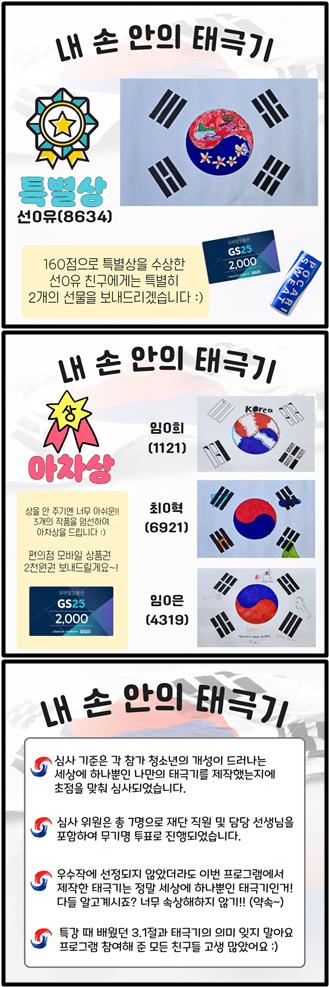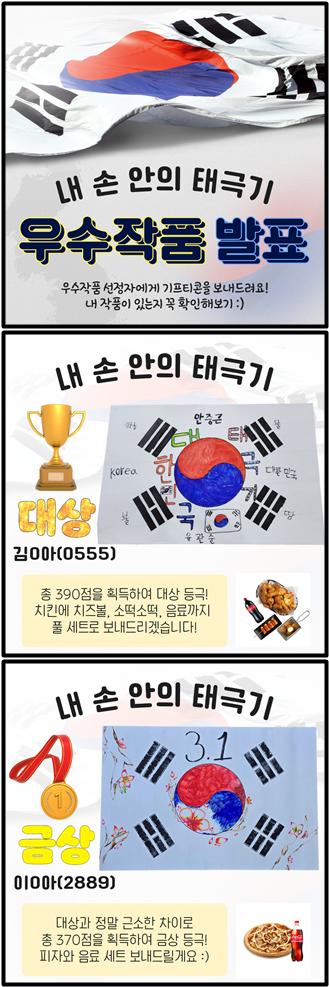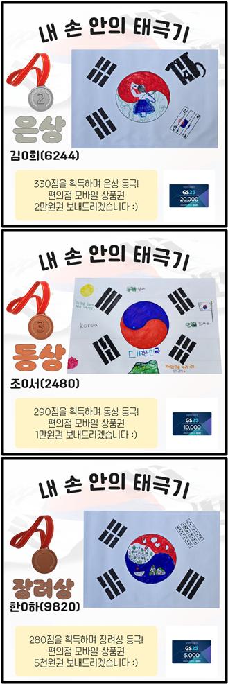 2024 '내 손 안의 태극기' 우수작품 발표 작성자 김재희 등록일자 2024년 3월 5일 17시 38분 43초 조회 411 image01.jpg [ Size : 69.84KB , Down : 347 ] 미리보기 다운로드 image02.jpg [ Size : 64.91KB , Down : 316 ] 미리보기 다운로드 image03.jpg [ Size : 73.41KB , Down : 320 ] 미리보기 다운로드 목록보기