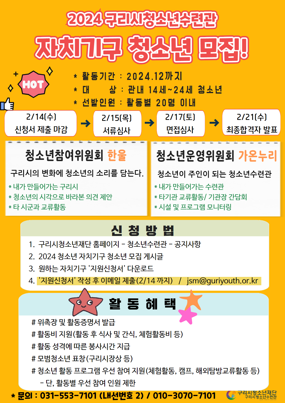 2024년 구리시청소년자치기구 신규인원 모집 작성자 조성민 등록일자 2024년 1월 17일 15시 37분 18초 조회 590 청소년참여위원회 지원신청 양식.hwp [ Size : 51KB , Down : 310 ] 다운로드 청소년운영위원회 지원신청 양식.hwp [ Size : 56KB , Down : 333 ] 다운로드 2024 청소년 자치기구 청소년 모집 공고(2월1일).jpg [ Size : 1.26MB , Down : 302 ] 미리보기 다운로드 목록보기