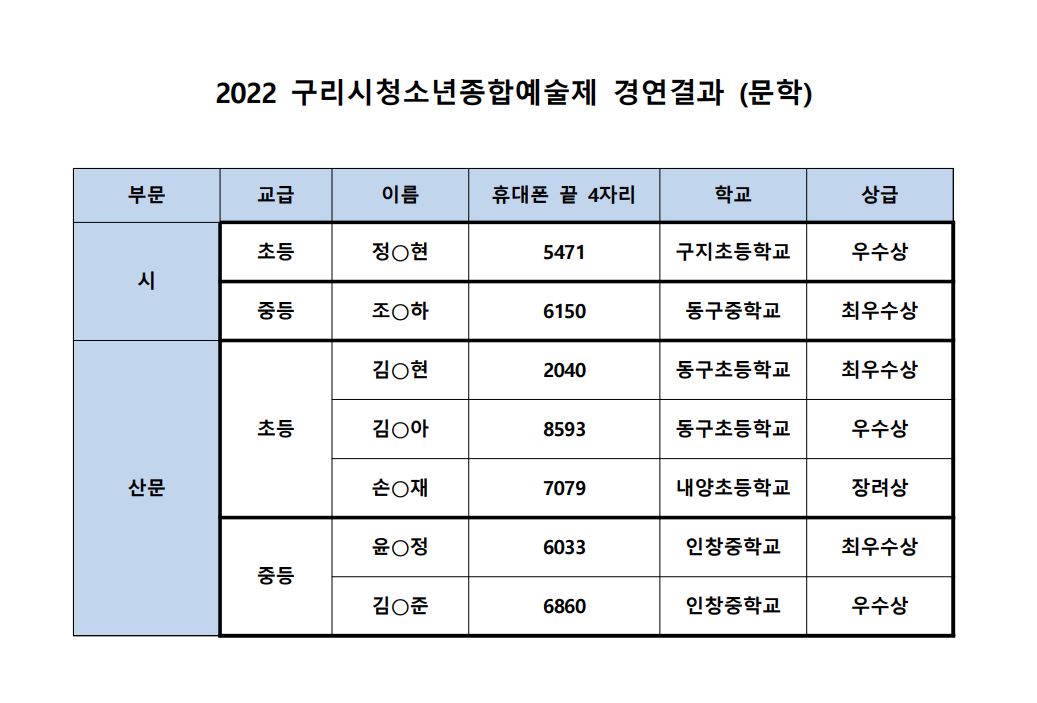 2022 구리시청소년종합예술제 문학경연 심사결과 작성자 관리자 등록일자 2022년 7월 29일 14시 38분 34초 조회 730 ▶ 참가한 모든 청소년 여러분 수고하셨습니다. ◀ 10월에 있는 경기도 본선 참가 대상에게는 개별적으로 연락 드릴 예정입니다. (8월에 본선 접수 진행) 문학.JPG [ Size : 81.74KB , Down : 581 ] 미리보기 다운로드 목록보기