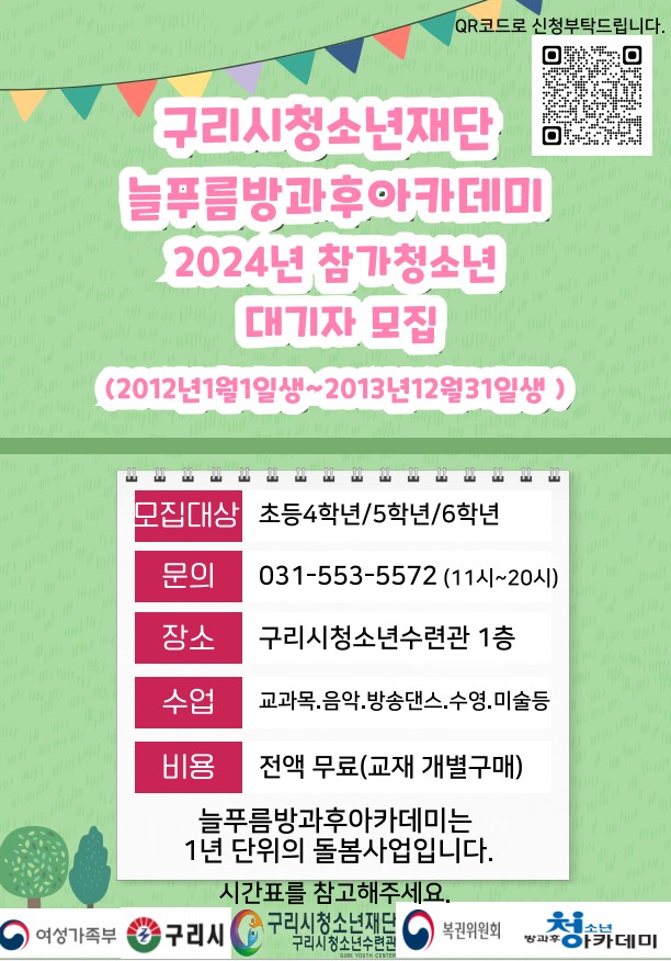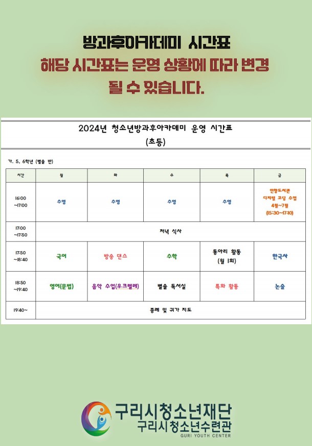 2024년 늘푸름방과후아카데미 초등반(예비5학년,5학년,6학년) 참가청소년을 모집합니다