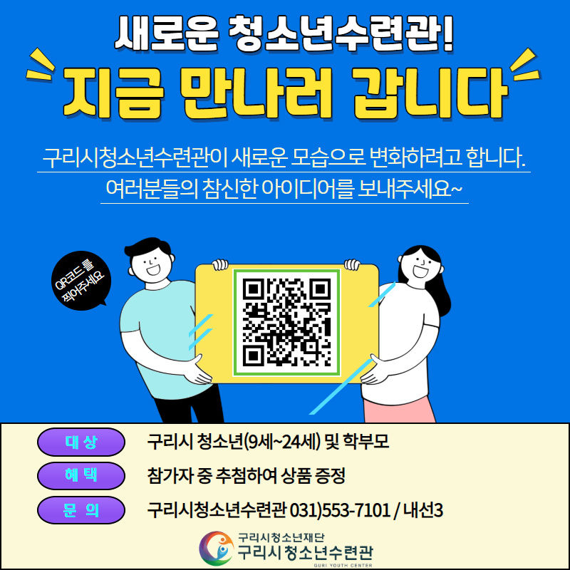 청소년프로그램 및 이용공간 개선 관련 설문조사 진행 작성자 관리자 등록일자 2020년 7월 31일 17시 58분 12초 조회 1,329 링크 바로가기 설문홍보.jpg [ Size : 248.72KB , Down : 384 ] 미리보기 다운로드 목록보기
