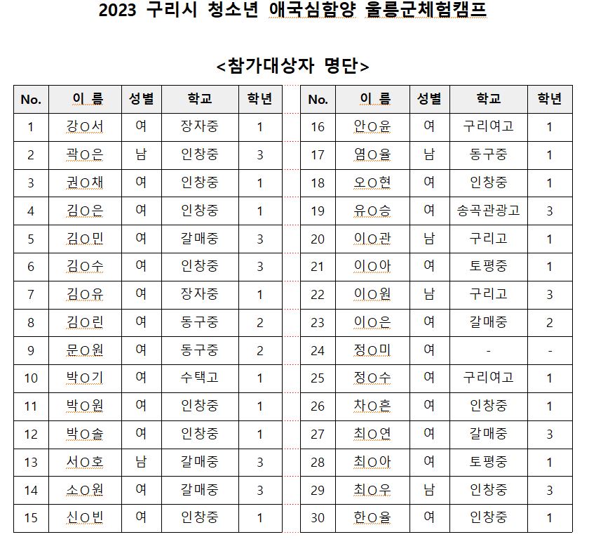 2023 구리시 청소년 애국심함양 울릉군체험캠프에 신청해주신 모든 분들께 감사의 말씀 드립니다.