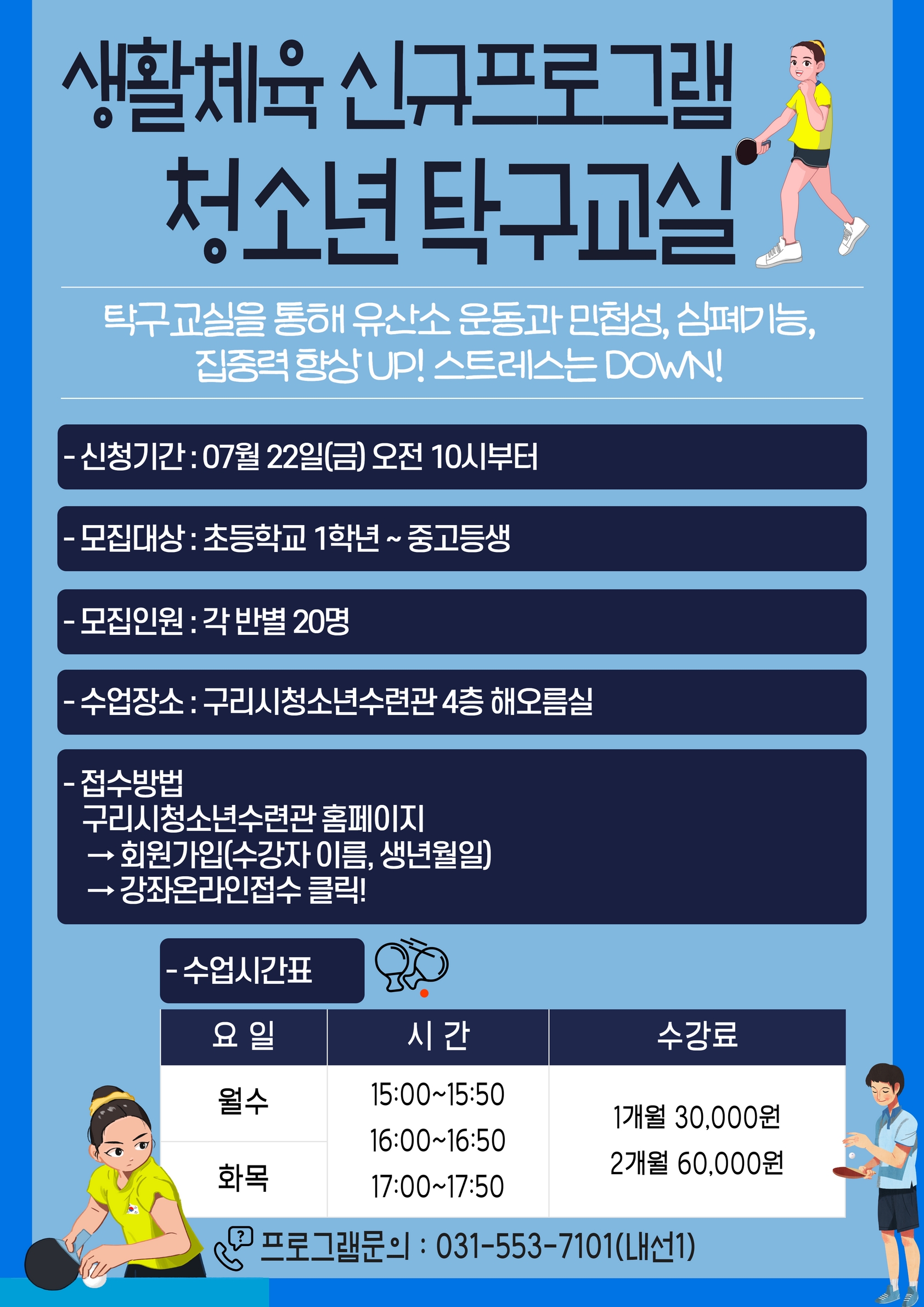 8월부터 진행되는 '청소년 탁구교실'을 통해 유산소운동과 민첩성, 심폐기능, 집중력 향상 UP!!! 시키고