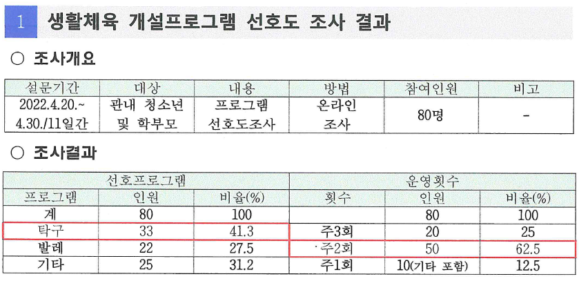 지난 4월 진행된 생활체육 신설 프로그램 선호도 조사 결과에 따라 '청소년 탁구교실'을 개설하게 되었습니다.
