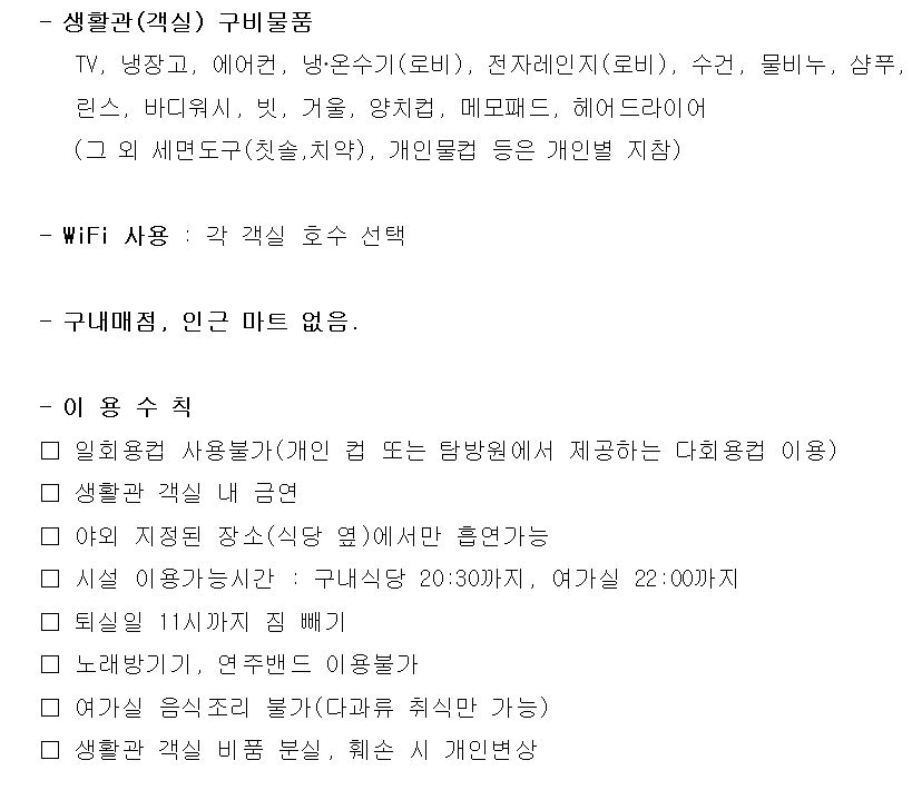 - 칫솔, 치약, 세안제(기타 생활관 구비물품은 아래 이용 안내문에서 확인)
