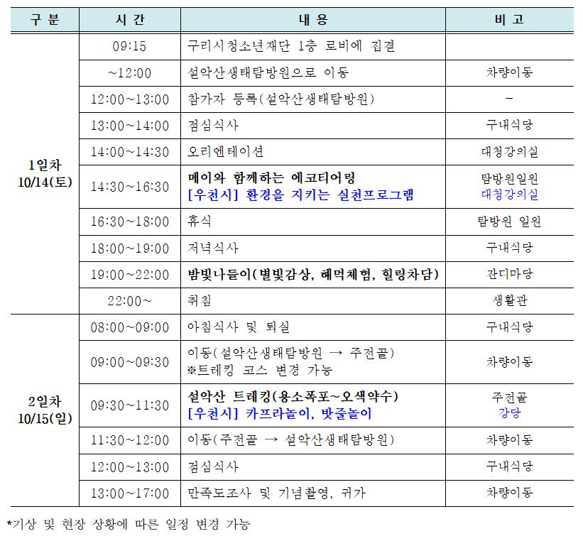 ** 1박 2일 동안 필요한 물품을 챙겨오시면 되고, 참고 사항 적어드립니다.
