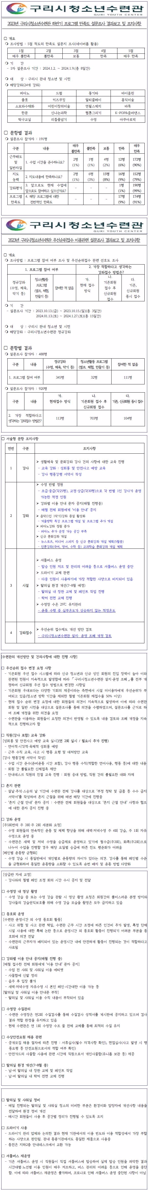 2023년 하반기 구리시청소년수련관 프로그램 만족도 및 우선순위접수 이용관련 설문조사 조치사항 작성자 박진한 등록일자 2024년 3월 19일 13시 44분 58초 조회 666 2023년 구리시청소년수련관 하반기 프로그램 만족도 및 우선순위접수 이용관련 설문조사 조치사항.jpg [ Size : 1.02MB , Down : 335 ] 미리보기 다운로드 목록보기