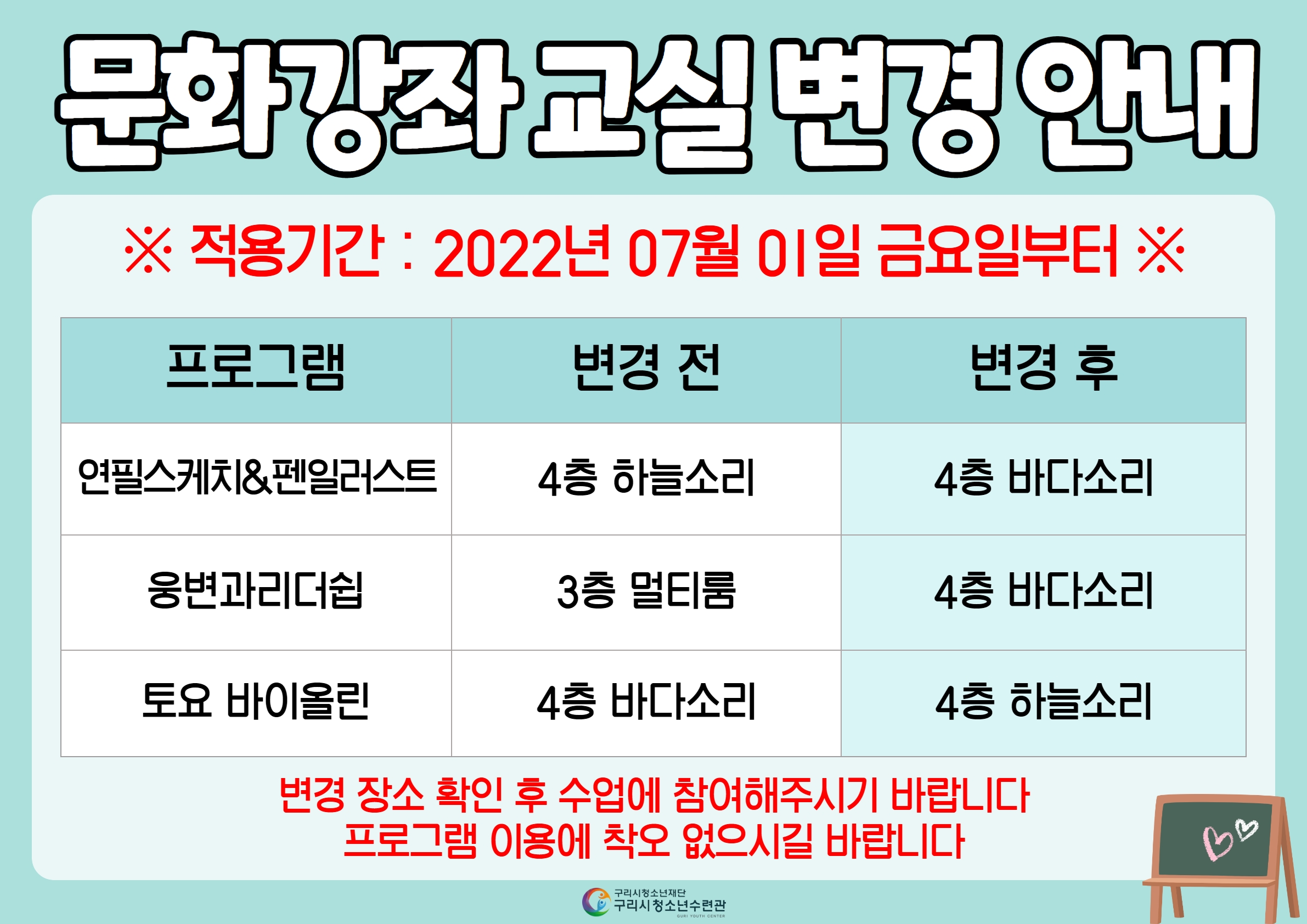 문화강좌 교실 변경 안내 작성자 관리자 등록일자 2022년 6월 28일 16시 6분 0초 조회 823 교실변경 (1).jpg [ Size : 786.79KB , Down : 671 ] 미리보기 다운로드 목록보기