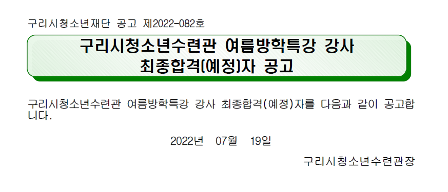 구리시청소년수련관 여름방학특강 강사 모집에 따른 최종합격(예정)자 공고 작성자 관리자 등록일자 2022년 7월 19일 18시 17분 4초 조회 546 공고.PNG [ Size : 52.9KB , Down : 327 ] 미리보기 다운로드 최종합격자 공고.pdf [ Size : 106.61KB , Down : 645 ] 다운로드 목록보기