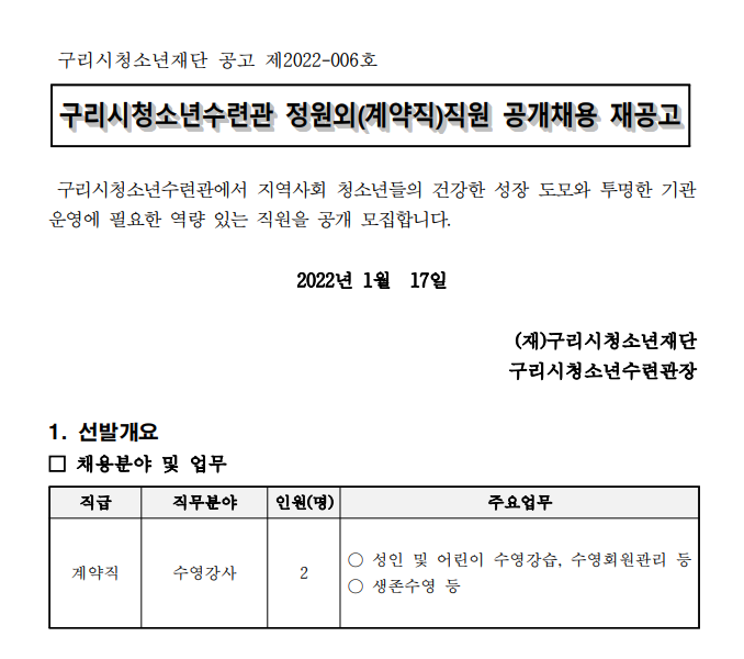 구리시청소년수련관 정원외(계약직-수영강사) 직원 공개채용 재공고 작성자 관리자 등록일자 2022년 1월 17일 17시 3분 19초 조회 732 Cap 2022-01-17 17-00-51-721.png [ Size : 91.1KB , Down : 523 ] 미리보기 다운로드 2022년도 구리시청소년수련관 정원외(계약직)직원 공개채용 재공고(안)..pdf [ Size : 170.26KB , Down : 616 ] 다운로드 구리시청소년재단 채용 응시원서 등(수영).hwp [ Size : 102.5KB , Down : 524 ] 다운로드 목록보기