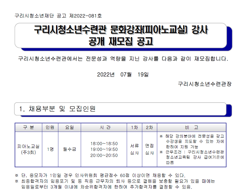 구리시청소년수련관 문화강좌(피아노 주3회) 강사 재모집 공고 작성자 관리자 등록일자 2022년 7월 19일 18시 13분 59초 조회 568 캡처.PNG [ Size : 72.23KB , Down : 371 ] 미리보기 다운로드 응시원서.hwp [ Size : 19KB , Down : 489 ] 다운로드 구리시청소년수련관 청소년교육팀 문화강좌(피아노교실) 강사 재모집 공고.pdf [ Size : 224.98KB , Down : 548 ] 다운로드 목록보기