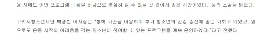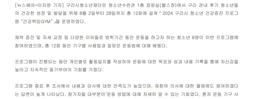 구리시청소년재단, 2024 구리시 청소년 건강증진 프로그램 '건강책임GYM' 운영 성료 작성자 이경주 등록일자 2024년 9월 2일 11시 41분 2초 조회 342 1-1.jpg [ Size : 126.02KB , Down : 196 ] 미리보기 다운로드 1-2.jpg [ Size : 71.93KB , Down : 186 ] 미리보기 다운로드 1-3.jpg [ Size : 26.89KB , Down : 193 ] 미리보기 다운로드 목록보기