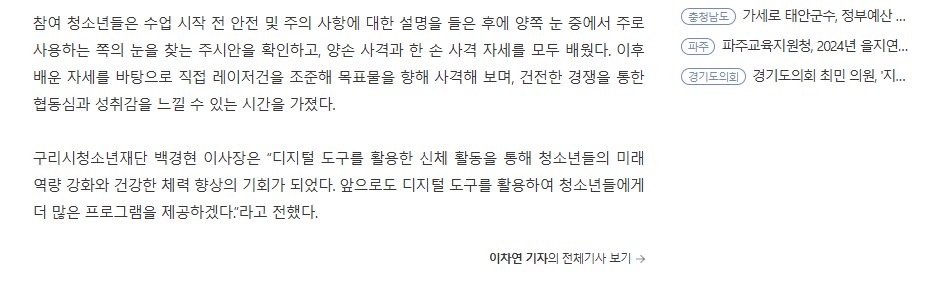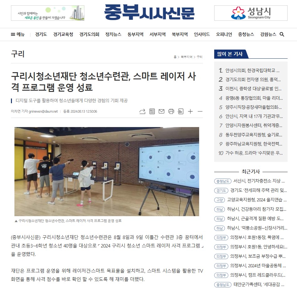 구리시청소년재단 청소년수련관, 스마트레이저사격 프로그램 운영 성료 작성자 이경주 등록일자 2024년 8월 14일 11시 44분 46초 조회 399 1.jpg [ Size : 211.94KB , Down : 165 ] 미리보기 다운로드 2.jpg [ Size : 64.62KB , Down : 163 ] 미리보기 다운로드 목록보기
