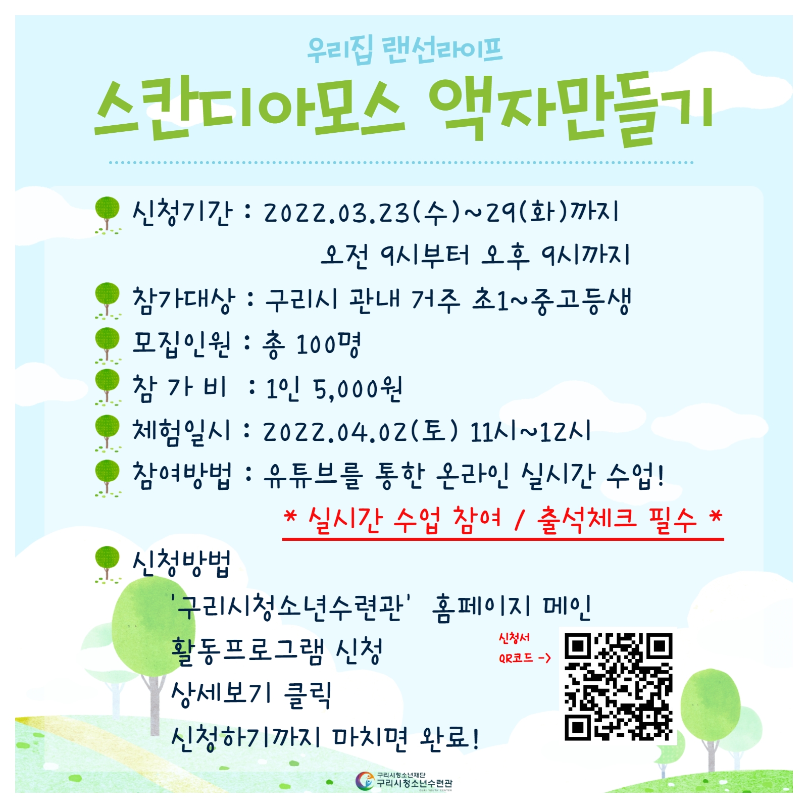 [구리=조태인기자] 구리시청소년재단 구리시청소년수련관은 3월 23일부터 오는 29일까지 우리집 랜선라이프 ‘스칸디아모스 액자만들기’ 프로그램 참가자를 모집한다고 밝혔다.