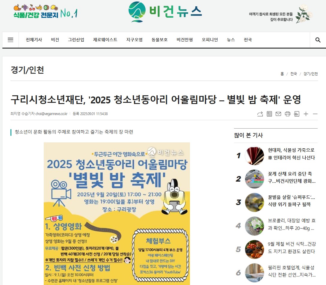 구리시청소년재단 청소년수련관, 2025 청소년동아리 어울림마당(별빛 밤 축제) 운영(비건뉴스 외 10곳)