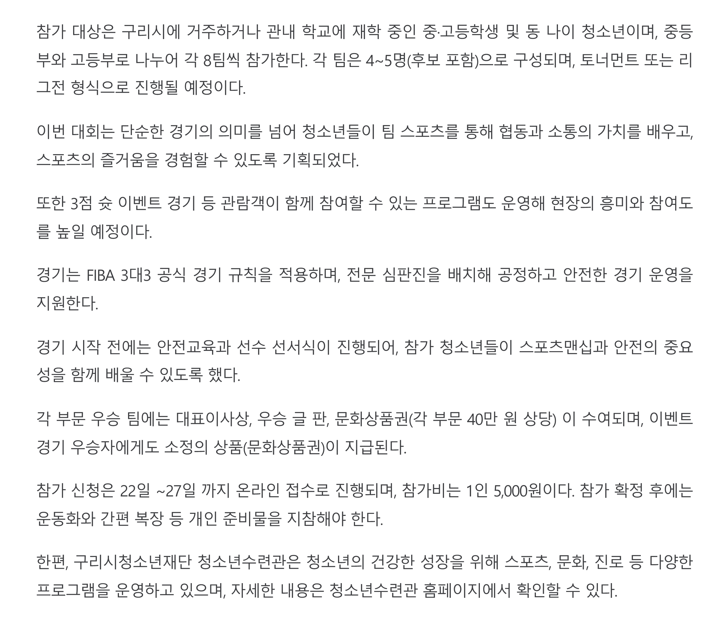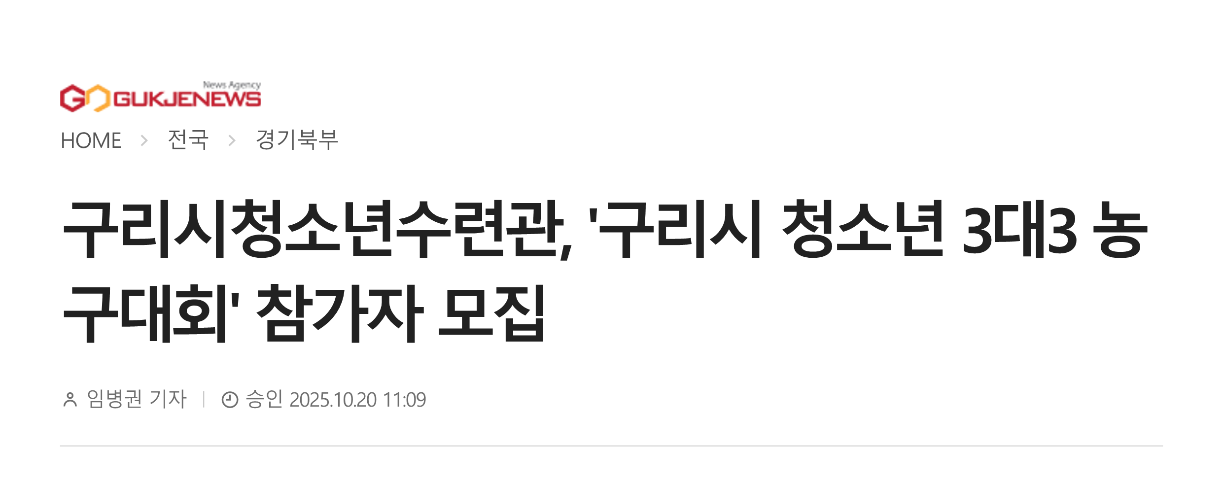 구리시청소년수련관, '구리시 청소년 3대3 농구대회' 참가자 모집 작성자 이경주 등록일자 2025년 10월 20일 13시 57분 27초 조회 127 1.png [ Size : 104.85KB , Down : 51 ] 미리보기 다운로드 인쇄하기_2.png [ Size : 5.11MB , Down : 41 ] 미리보기 다운로드 인쇄하기_3.png [ Size : 360.95KB , Down : 39 ] 미리보기 다운로드 목록보기
