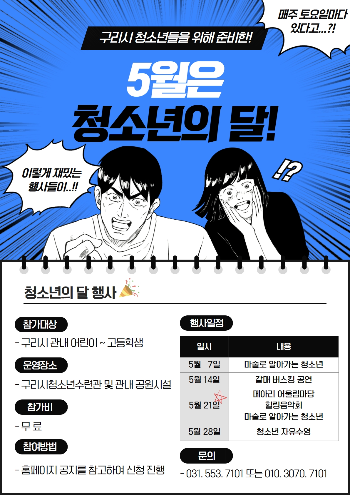 '5월은 청소년의 달' 행사 일정은 5월 매주 토요일인 7일 마술로 알아가는 청소년, 14일 갈매 버스킹 공연, 21일 메아리 어울림마당 힐링음악회, 마술로 알아가는 청소년, 28일 청소년 자유수영이며, 구리시청소년수련관 및 관내 공원시설(갈매광장, 구리광장 등)에서 운영한다.