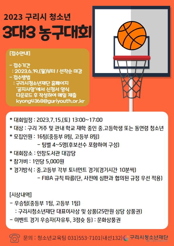 구리시청소년재단 산하 청소년수련관에서 청소년스포츠 활동 활성화와 건전한 여가체육활동 참여 기회를 확대하고자 오는 7월 15일(토)에 ‘2023 구리시 청소년 3대3 농구대회’를 운영한다.(사진=구리시)