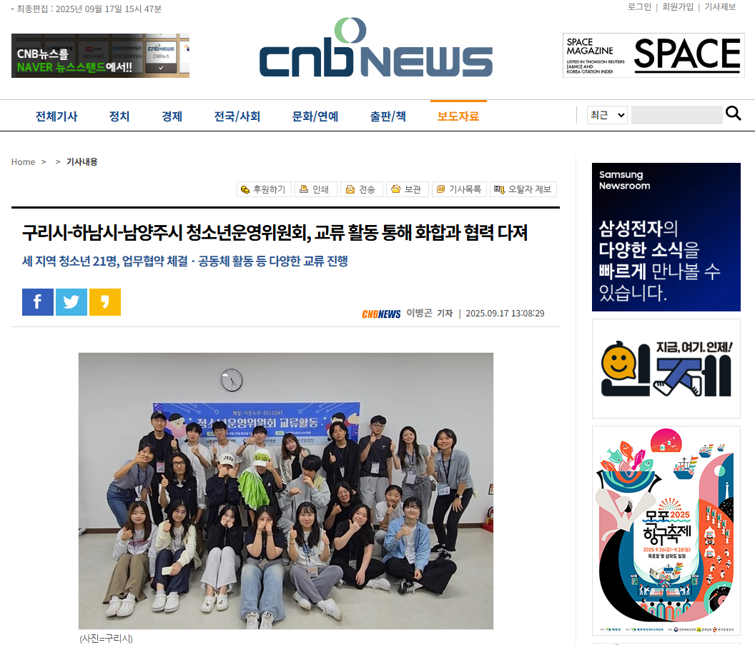 구리-하남-남양주 청소년운영위원회, 교류 활동 통해 화합과 협력 다져(CNB뉴스 외 6건)
