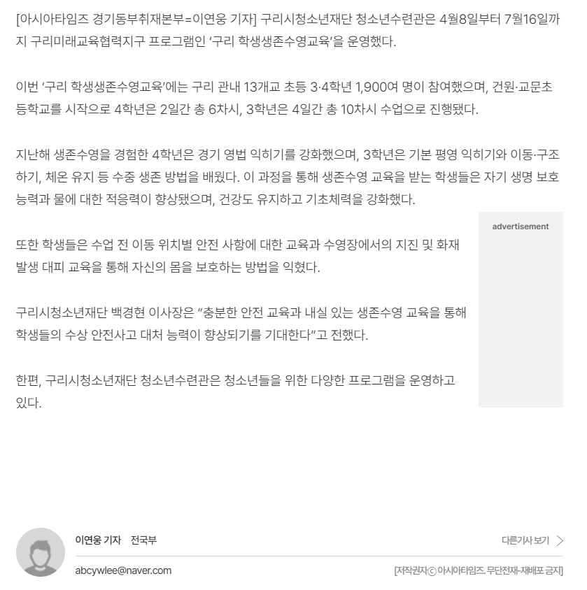 구리시청소년재단 청소년수련관, '2024 학생생존수영교육' 운영 성료 작성자 이경주 등록일자 2024년 7월 23일 10시 1분 48초 조회 288 1.png [ Size : 280.62KB , Down : 145 ] 미리보기 다운로드 2.png [ Size : 110.04KB , Down : 150 ] 미리보기 다운로드 목록보기