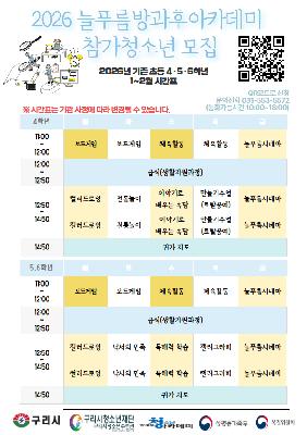 게시판 검색 표시줄수 : 3개씩 보기6개씩 보기9개씩 보기12개씩 보기15개씩 보기18개씩 보기21개씩 보기24개씩 보기27개씩 보기30개씩 보기 검색 대상 : 전체 검색제목내용 검색어 : 검색 총 1,659건(1/185페이지) [늘푸름방과후아카데미] 1월13일 컵타악기 프로그램 진행 2026-01-13 청소년운영위원회 가온누리 1월 정기회의 2026-01-13 구리시청소년참여위원회 2026년 1월 정기회의 2026-01-13 [늘푸름방과후아카데미] 1월12일 입학식 2026-01-12 □늘푸름방과후아카데미 2026 신규참가청소년 모집 2026-01-08 [늘푸름방과후아카데미] 구리소방서 어린이 불조심 포스터 공모전 수상 2026-01-02 [늘푸름방과후아카데미] 12월15일 겨울 콩마켓 진행 2025-12-16 □늘푸름방과후아카데미 2026 신규참가청소년 모집 2025-12-15 [늘푸름방과후아카데미] 12월12일 소방 안전 체험학습 2025-12-12 ◀ 1 2 3 4 5 6 7 8 9 10 다음 ▶