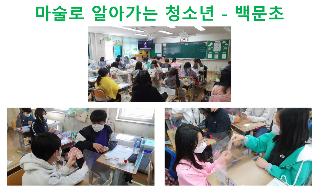 지난 4월 13일, 15일에 백문초등학교 3학년~6학년을 대상으로 [마술로 알아가는 청소년 - 인권교육]이 진행되었습니다.