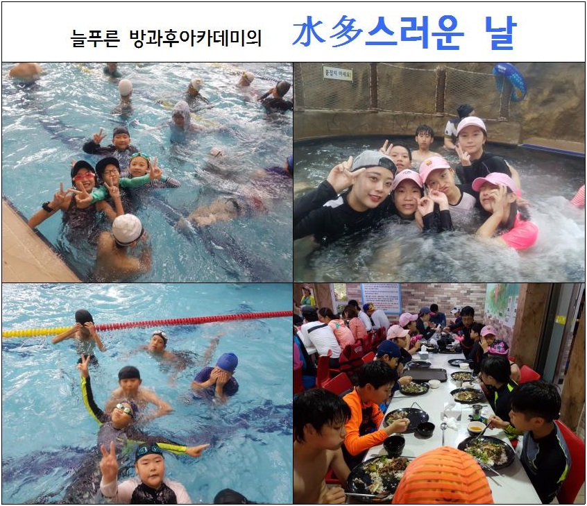 2017늘푸른청소년방과후아카데미 水多스러운날 토요체험 작성자 관리자 등록일자 2017년 7월 17일 15시 1분 40초 조회 709 이번달 토요체험은 열심히 공부 한 후 기말고사를 보고 친구들과 함께 스트레스도 풀고 더운 여름 시원한 워터파크에서 신나게 놀다왔습니다. 활동 할때도 열심히 노는 방과후아카데미 친구들 입니다! 7월토체 사진001.jpg [ Size : 277.06KB , Down : 129 ] 미리보기 다운로드 목록보기