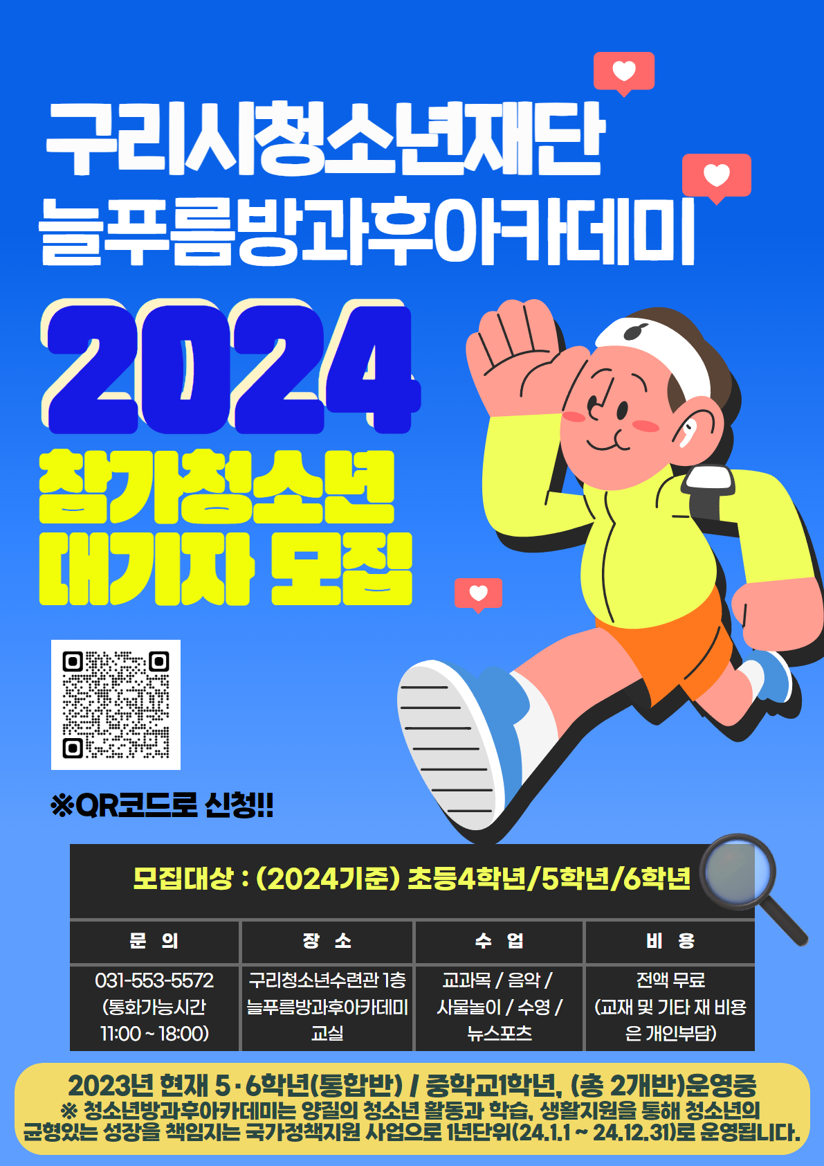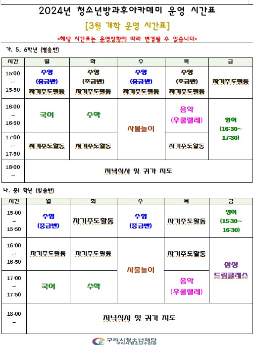 2024년 늘푸름방과후아카데미 돌봄교실 초등반(5학년,6학년) 중등반(중1) 청소년 대기자 모집합니다.