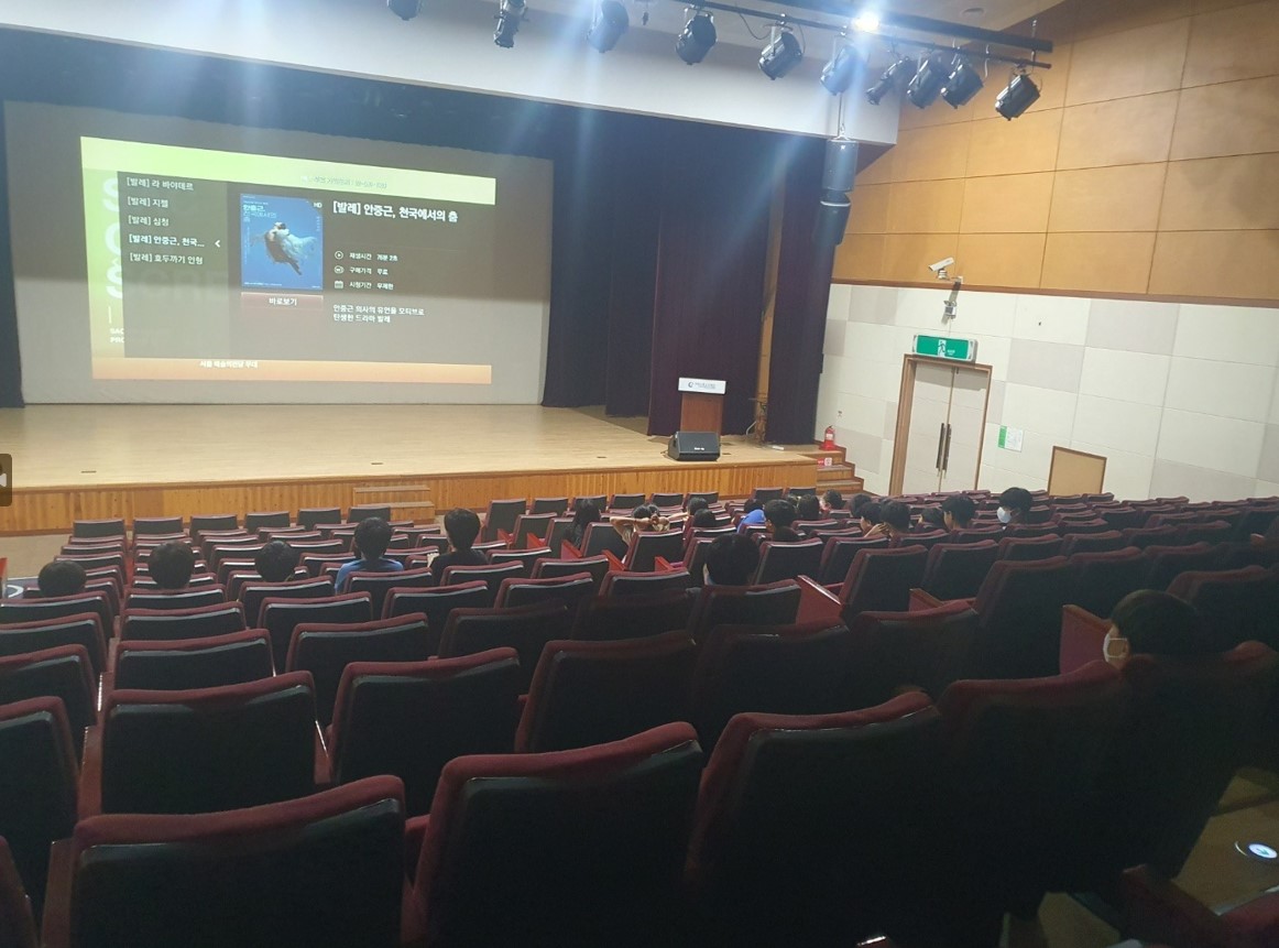 안녕하세요~ 늘푸름방과후아카데미 입니다!^^ 오늘은 2023 예술의 전당 SAS ON SCREEN 인 영상으로 만나는 발레공연 <안중근, 천국에서의 춤>을 관람하였습니다. 공연장에 큰 스크린으로 보니 영상이 더욱 실감나 청소년들이 흥미로워 하였습니다. 하였습니다.