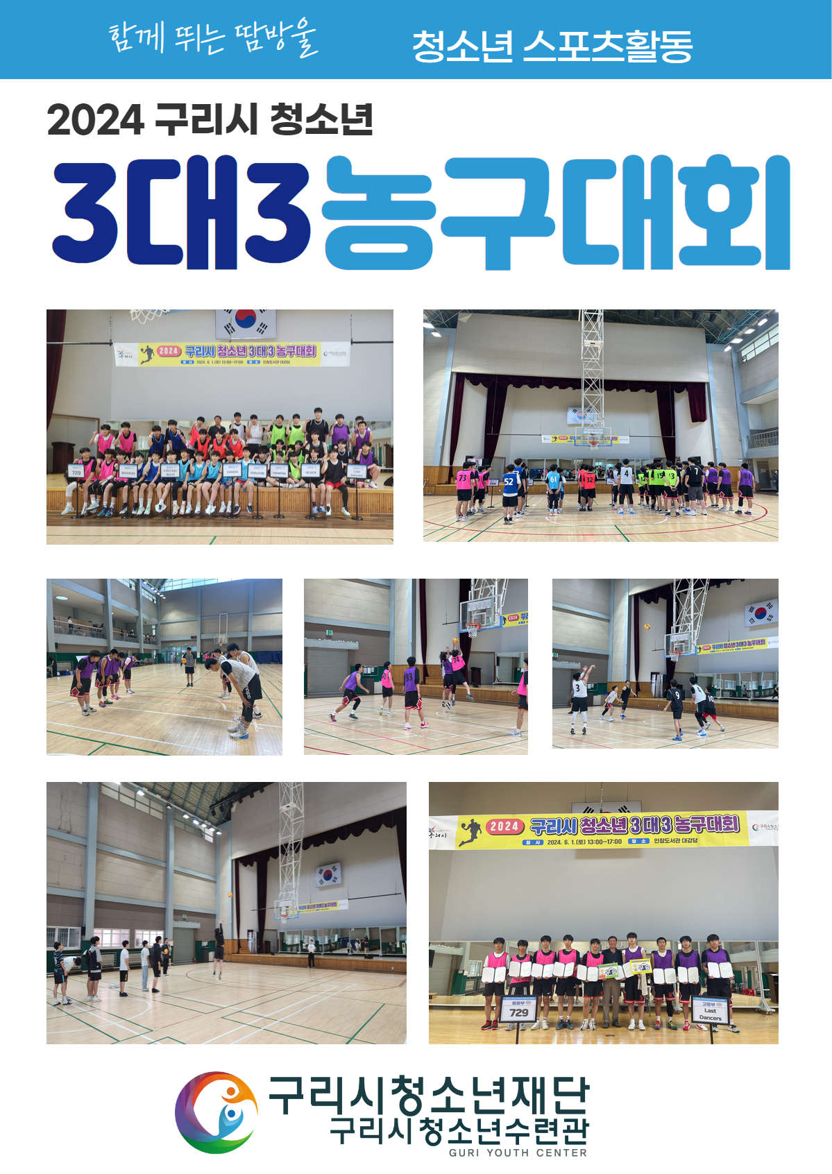 2024 구리시 청소년 3대3 농구대회 작성자 이경주 등록일자 2024년 6월 3일 17시 31분 57초 조회 333 6월 1일 인창도서관 대강당에서 '2024 구리시 청소년 3대3 농구대회'를 진행하였습니다.구리 관내 중등부 4팀, 고등부 4팀이 참여하여 각각 리그전으로 진행되었으며, 리그전 진행 후 중등부.고등부 각 우승팀의 매칭 경기와 대회 응원을 위해 참석한 청소년, 학부모들을 대상으로 3점슛 이벤트 프로그램 진행으로 다양함과 재미를 더했습니다.- 중등부 우승 : 729- 고등부 우승 : Last Dancers 20240601.jpg [ Size : 1.47MB , Down : 97 ] 미리보기 다운로드 목록보기