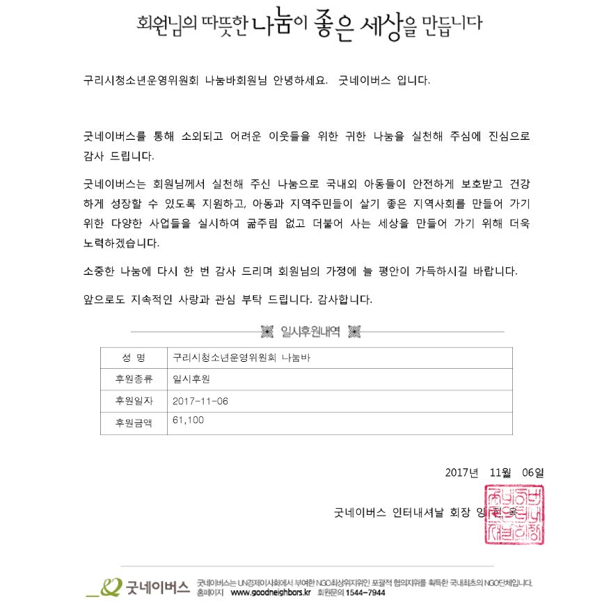 운영진이 수령한 금61,100원을 굿네이버스에 후원하였습니다.