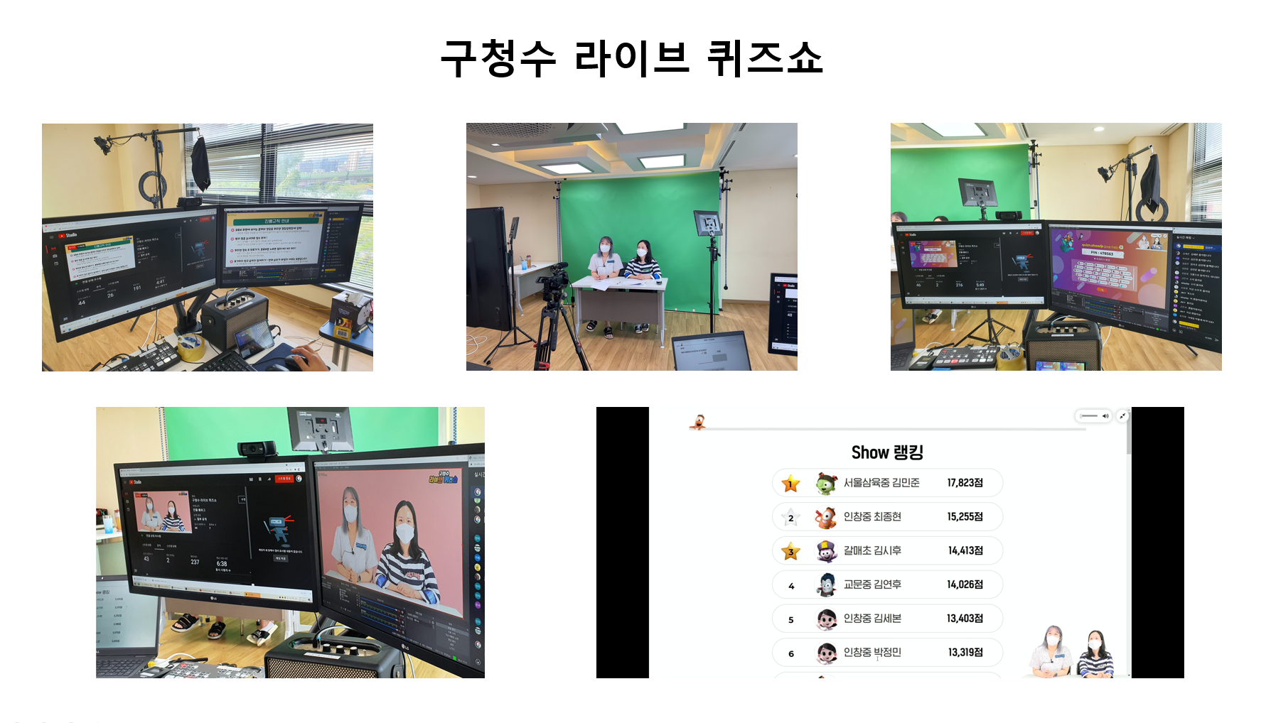 퀴즈쇼는 연습퀴즈 4문항, 실전퀴즈 30문항으로 구리시, 수련관, 역사, 환경, 어휘, 넌센스, 상식 등 다양하게 출제하였고,