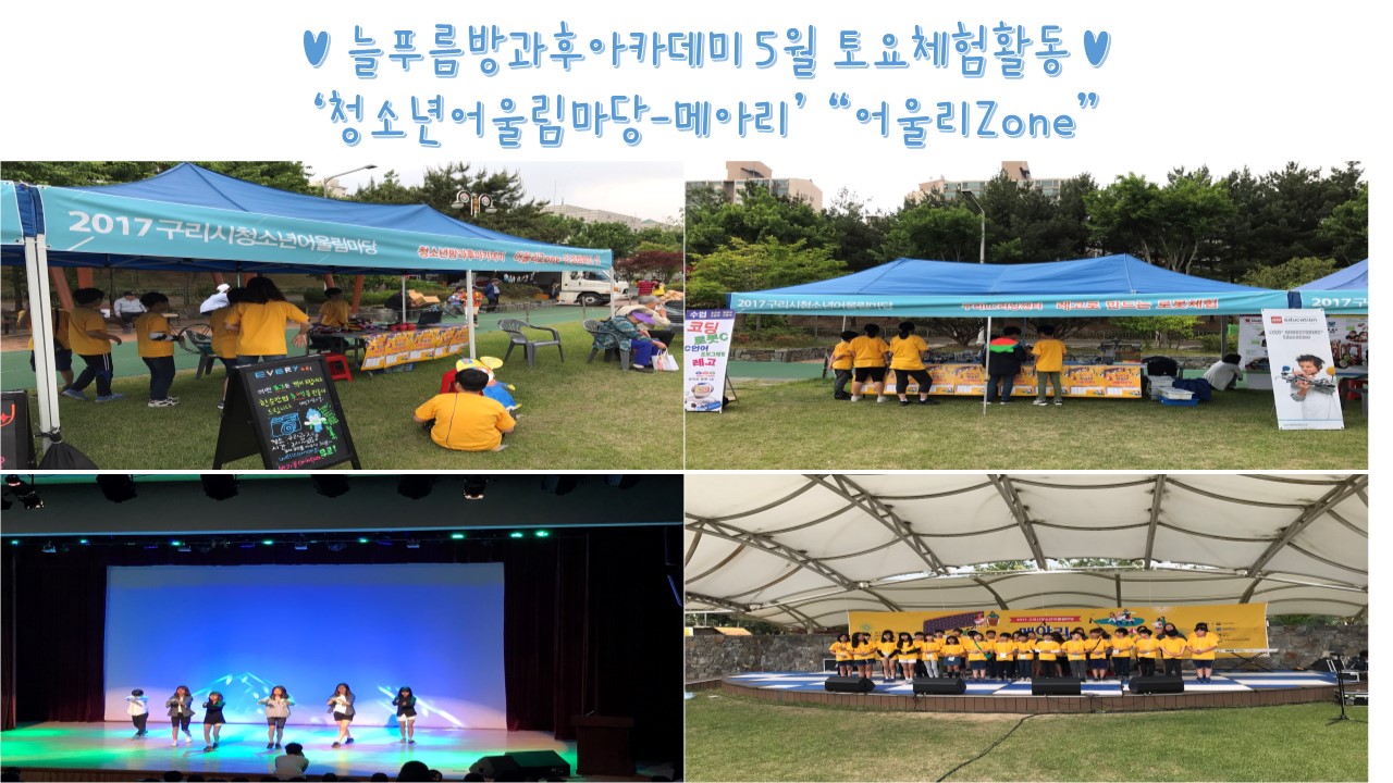 늘푸름방과후아카데미에서는 5월 토요체험활동으로 구리시청소년수련관어울림마당-메아리에 '어울리Zone' 이름으로 함께 참여했습니다^.^